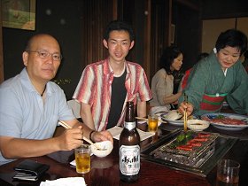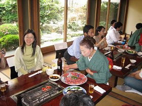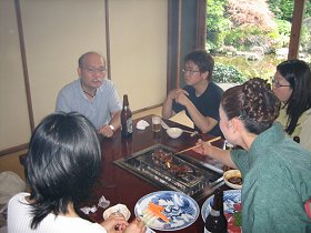 普通のお座敷なんですが、テーブルに炭火が入り、網がまた貫禄のある網なんです。(よく使い込まれた網)部屋からは、手入れの行き届いた日本庭園とお決まりの「でっかい鯉」が泳いでいるのが眺められ雰囲気もよかったです。・・・縁側から出て、おいしい日本酒を片手に、庭で一杯やっていた後輩たちもいたっけ・・・。